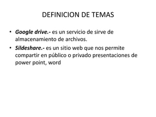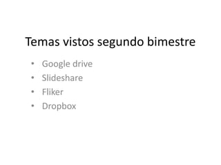 El documento lista cuatro temas vistos en el segundo bimestre: Google Drive, Slideshare, Flicker y Dropbox. Brevemente describe a Google Drive como un servicio de almacenamiento de archivos y a Slideshare como un sitio para compartir presentaciones de PowerPoint y Word pública o privadamente. También menciona que los blogs son fáciles de usar para publicar contenido.