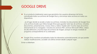 Este documento proporciona instrucciones sobre cómo cambiar la configuración de compartir archivos y carpetas en Google Drive. Explica que los usuarios pueden elegir quién puede ver los elementos compartidos y qué permisos tienen (como ver, editar o comentar). Ofrece opciones como compartir con ciertos usuarios, cualquier persona con el enlace o públicamente, y describe los pasos para cambiar la configuración de visibilidad y permisos.