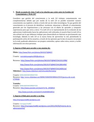 La relación entre la gestión del conocimiento y la Web 2.0 es complementaria. La gestión del conocimiento implica identificar, recolectar, almacenar y difundir el conocimiento generado dentro de las organizaciones para aprender y compartir experiencias. La Web 2.0 permite a los usuarios participar activamente compartiendo información a través de redes sociales y contenidos generados por los usuarios. Juntas, facilitan transmitir y compartir conocimiento explícito o tácito entre personas.