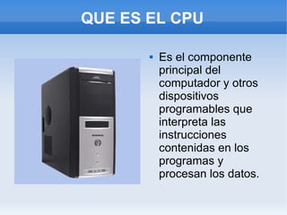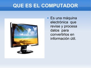 El documento proporciona definiciones de varios términos tecnológicos clave como computadora, CPU, sitios web como Hotmail y Gmail, navegadores, sistemas operativos como Ubuntu, malware, hardware, software, redes sociales como Facebook y Twitter, motores de búsqueda como Google, y otros conceptos relacionados con computadoras.