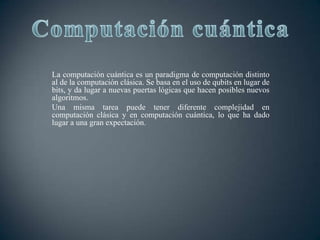 La computación cuántica utiliza qubits en lugar de bits, permitiendo el procesamiento paralelo y nuevas puertas lógicas, lo que puede reducir drásticamente el tiempo de ejecución de algoritmos. A diferencia de la computación clásica, donde cada bit tiene un estado discreto, los qubits pueden representar múltiples estados simultáneamente. Los algoritmos cuánticos están clasificados por su complejidad en la clase BQP, que mide su resolución en tiempo polinómico con un error bajo.