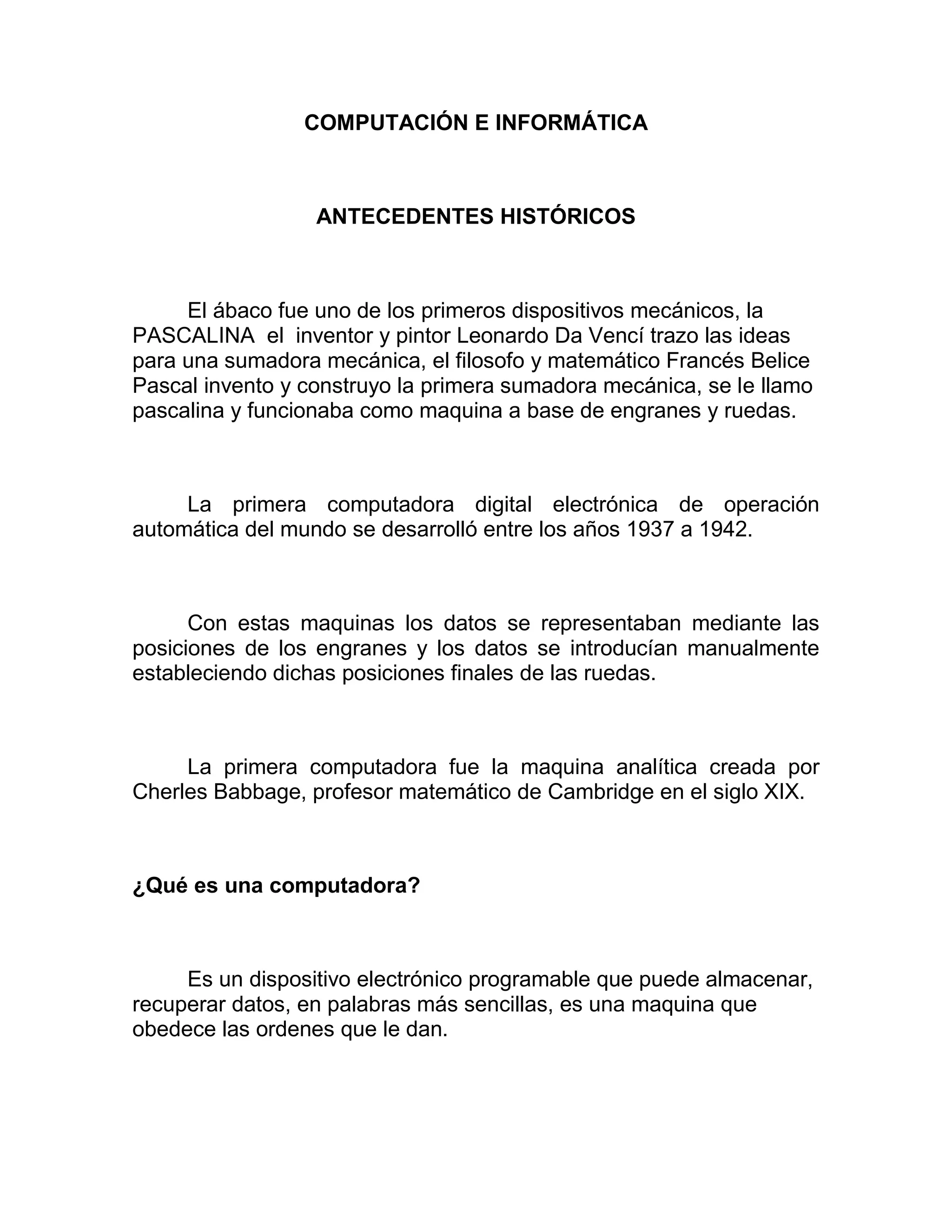 El documento proporciona una historia general de la computación e informática, describiendo dispositivos mecánicos antiguos como el ábaco y la máquina analítica de Babbage, y los componentes físicos y software de una computadora moderna, incluidos el hardware, sistema operativo y lenguajes de programación. También clasifica las computadoras por capacidad, tipo y uso, e introduce conceptos como codificación binaria, memoria y almacenamiento de datos.