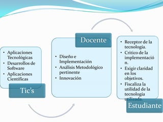 Este documento discute el rol de las tecnologías de la información y la comunicación (TIC) en la educación desde las perspectivas del profesor y el estudiante. Propone formar grupos para debatir cómo las TIC afectan los roles del profesor y el estudiante, y qué criterios se pueden usar para determinar si un software es útil para fines educativos.