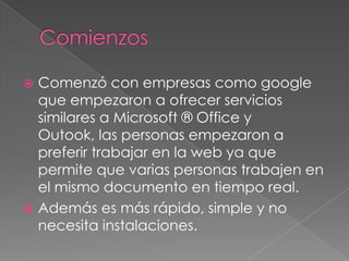 La computación en la nube comenzó cuando empresas como Google empezaron a ofrecer servicios en línea similares a Microsoft Office, permitiendo que varias personas trabajen en el mismo documento en tiempo real de forma más rápida y sencilla sin necesidad de instalaciones. La computación en la nube ofrece todos los servicios de un sistema informático a través de Internet, permitiendo a los usuarios acceder a servicios flexibles de forma remota pagando solo por el uso. Una infraestructura 100% en la nube no requiere hardware, ofreciendo simplicidad y menor invers