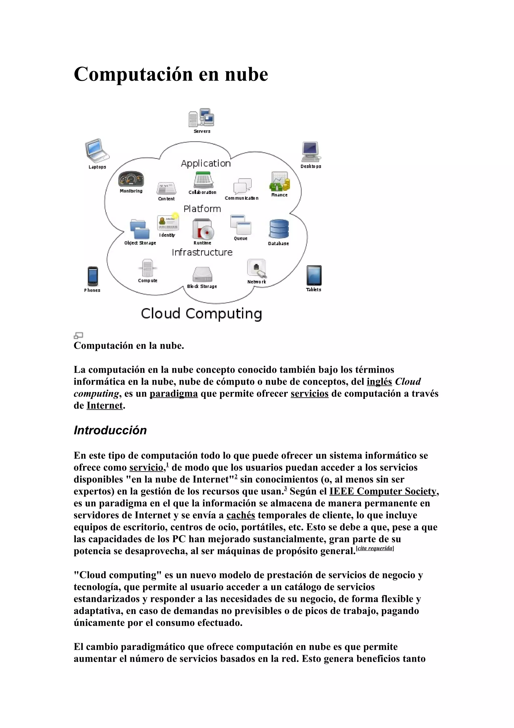 La computación en la nube permite ofrecer servicios de computación a través de Internet. Existen tres capas principales: infraestructura como servicio, plataforma como servicio y software como servicio. La computación en la nube ofrece beneficios como escalabilidad, bajo costo y actualizaciones automáticas, pero también plantea desafíos en términos de seguridad, privacidad y dependencia de proveedores.