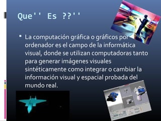 La computación gráfica utiliza computadoras para generar imágenes visuales sintéticas y manipular información visual del mundo real. La composición digital combina diferentes tipos de imágenes para crear imágenes complejas en movimiento. Los gráficos 2D almacenan datos geométricos y estilos, mientras que los gráficos 3D crean arte digital tridimensional. El sombreado simula cómo se iluminan las caras de un polígono, y las texturas añaden detalles a los polígonos que afectan su sombreado.