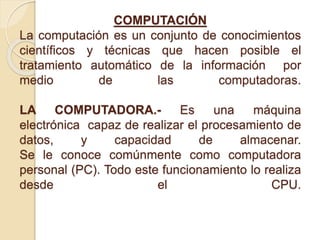 La computación es el tratamiento automático de la información mediante computadoras, que integran hardware y software. La memoria se clasifica en tipos como RAM y ROM, mientras que el CPU es el núcleo que ejecuta procesos. Los periféricos permiten la entrada y salida de información, y existen diversas unidades de almacenamiento que mantienen datos de forma temporal o permanente.