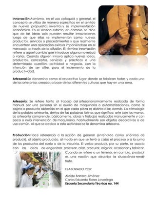 Este documento define varios términos clave relacionados con la ciencia y la tecnología. Define la ciencia como el conocimiento obtenido mediante la observación sistemática y el método científico. Explica que la técnica se refiere a los procedimientos reglamentados para lograr un objetivo, y que la tecnología implica los conocimientos y habilidades para transformar el medio ambiente. También define la ergonomía, la innovación, la producción, la artesanía y los términos relacionados.