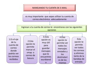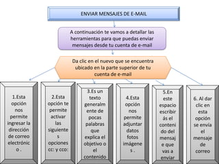 1. El documento ofrece instrucciones sobre cómo utilizar una cuenta de correo electrónico, incluyendo opciones para ver y organizar mensajes, enviar mensajes adjuntando archivos, y revisar la bandeja de entrada y mensajes no deseados.
