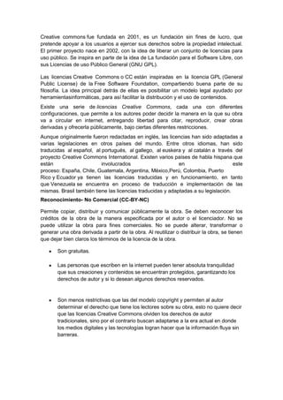 Este documento describe la relación entre la gestión del conocimiento y la Web 2.0. Ambos comparten información diariamente para crear redes e información que potencian el desarrollo e innovación. La Web 2.0 ha proporcionado la tecnología para cambiar el paradigma de los usuarios hacia la gestión de información y conocimiento. El documento también explica las licencias Creative Commons, que permiten a los autores decidir cómo circulará su obra en Internet.
