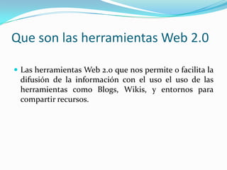 Este documento describe las herramientas Web 2.0 y sus ventajas y desventajas. Las herramientas Web 2.0 como blogs, wikis y entornos de compartir recursos permiten la difusión de información. Ofrecen ventajas como crear documentos, hojas de cálculo y presentaciones en línea y compartir información de forma actualizada con muchas personas. Sin embargo, también tienen desventajas como posibles cambios en los servicios, compartir información privada con terceros y falta de copias de seguridad.