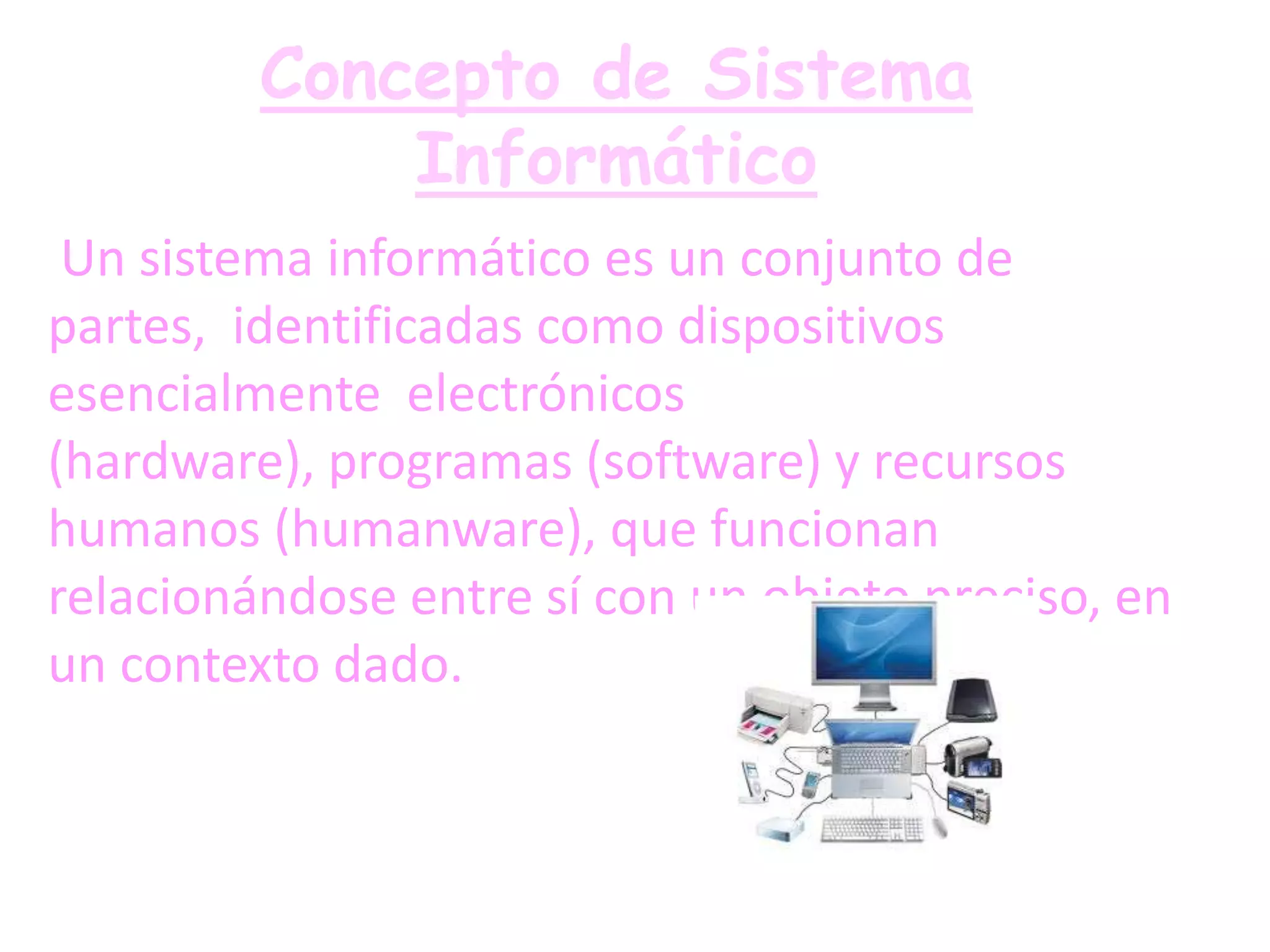El documento describe los componentes fundamentales de un sistema informático, incluyendo hardware, software, firmware, infoware y humanware. Explica la CPU, memoria, tarjetas de video y audio, puertos, placa madre y otros componentes de una computadora. También cubre el proceso de entrada, procesamiento y salida de información, unidades de medida como bytes y hercios, y diferentes tipos de periféricos.