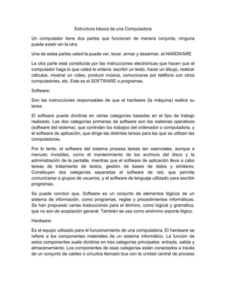 El documento describe las partes principales de una computadora, incluyendo el hardware y el software. El hardware se refiere a los componentes físicos como la unidad central de procesamiento (CPU), la memoria, y las unidades de almacenamiento como discos duros y unidades de disquete. El software incluye los sistemas operativos y programas de aplicación que hacen funcionar la computadora. El documento explica la función de cada parte y cómo trabajan juntas.