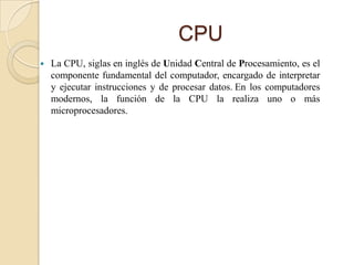 La CPU o unidad central de procesamiento es el componente principal del computador que interpreta y ejecuta instrucciones y procesa datos. La mayoría de CPUs modernas son microprocesadores integrados en un solo chip. La placa base contiene el chipset, ranuras de expansión y zócalos donde se montan los circuitos electrónicos como la CPU. La memoria RAM almacena temporalmente la información, datos y programas que la CPU procesa, y existe en varios tipos como SDRAM, DDR SDRAM y DDR3 SDRAM. También hay memorias especializadas como