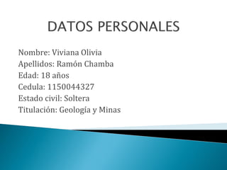 La ficha presenta los datos personales de Viviana Olivia Ramón Chamba, una mujer soltera de 18 años que estudia Geología y Minas. El documento también explica que las herramientas de la web 2.0 permiten compartir información, interactuar con otros, chatear en línea de forma económica y gratuita, sin preocuparse por licencias.