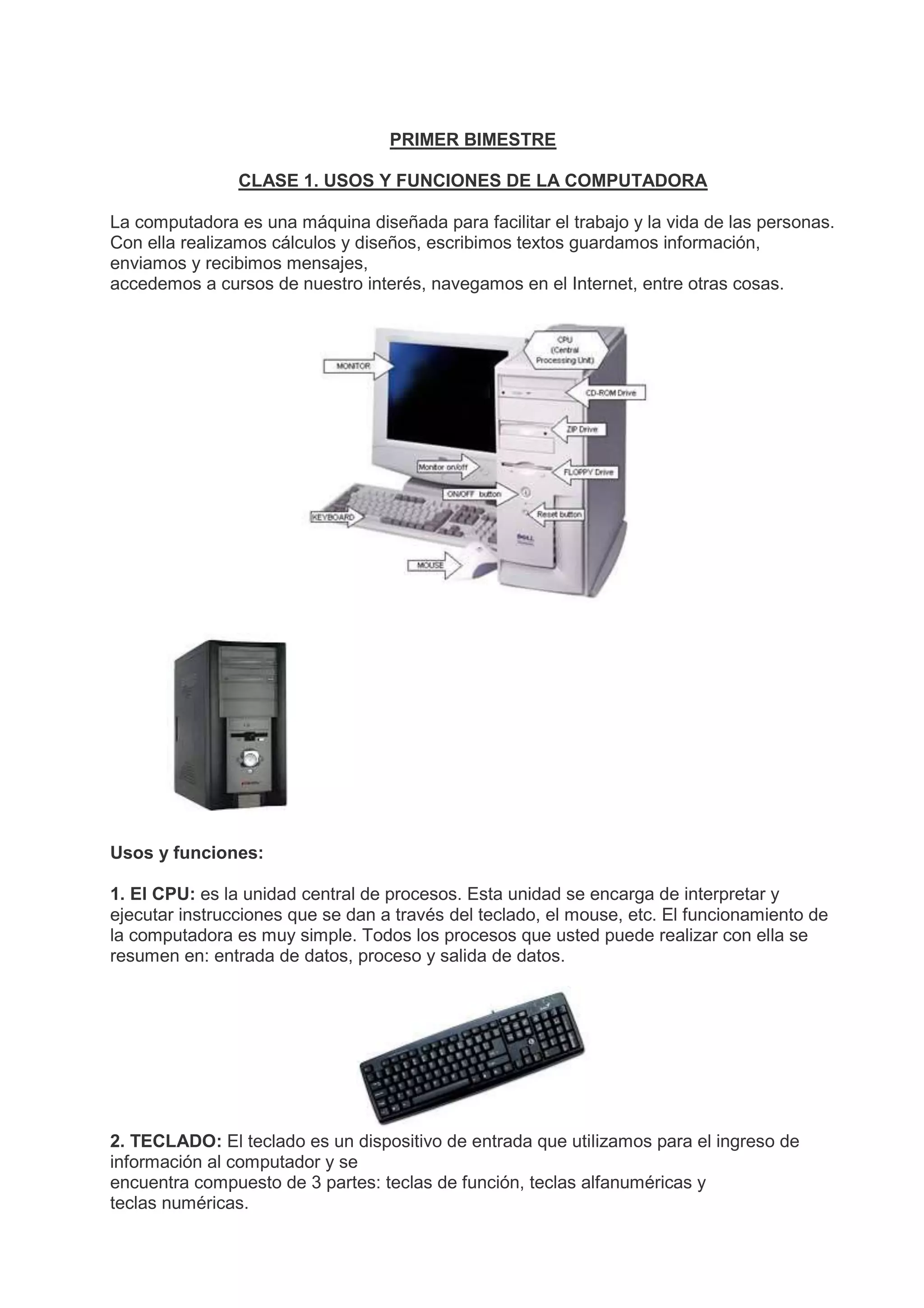 Este documento presenta información sobre las primeras clases de una capacitación en computación. Explica los usos y funciones básicas de la computadora, el escritorio y entorno de Windows, el menú inicio y programas, unidades de almacenamiento como el USB, y conceptos básicos de Word como la ventana de trabajo. También incluye tareas para que los estudiantes practiquen los temas vistos.