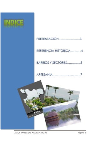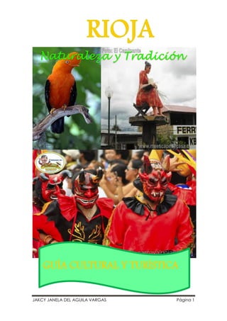 Este documento presenta una guía cultural y turística de la provincia de Rioja, ubicada en el norte del departamento de San Martín, Perú. La guía describe brevemente la historia de Rioja, incluyendo su población prehispánica y su participación en la independencia de Perú. Además, presenta los principales barrios y sectores de Rioja, sus danzas y artesanías tradicionales, como la fabricación de sombreros de paja toquilla, por la cual es reconocida la región. El objetivo de la
