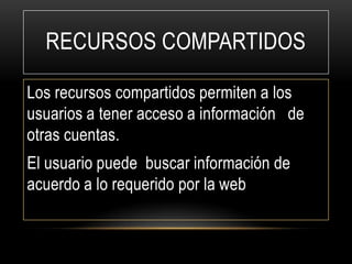 Este documento describe los recursos compartidos y sus ventajas. Los recursos compartidos permiten a los usuarios acceder a información de otras cuentas de manera gratuita y fácil. Pueden incluir presentaciones, fotos, videos y estar disponibles para todos los usuarios o solo algunos de manera privada. Las ventajas incluyen poder encontrar y compartir información de manera gratuita y rápida. Programas populares para compartir recursos son YouTube, Flickr y SlideShare.