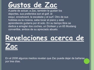 Zac Efron es un actor y cantante estadounidense nacido en 1987 en California. Le gustan deportes como el golf, el esquí y el surf, y también toca el piano y la guitarra. Se hizo famoso por protagonizar las películas de High School Musical y Hairspray.