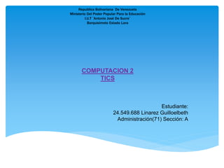 El documento define las Tecnologías de la Información y la Comunicación (TIC) como el conjunto de tecnologías para gestionar y enviar información. Explica que las TIC tienen características como ser innovadoras, beneficiar el área educativa y estar relacionadas con Internet y la informática. Además, señala que las TIC son herramientas importantes para optimizar procesos administrativos y que los administradores deben tener buen manejo de ellas dado que vivimos en una sociedad digital.