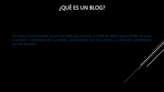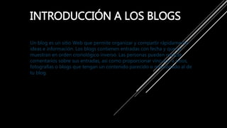 El documento habla sobre blogs, explicando que son sitios web que permiten compartir e intercambiar ideas de forma rápida. Luego, describe brevemente algunas herramientas populares para crear blogs como WordPress, Blogger, Blog.com, Blogetery y Google Sites, destacando ventajas como facilidad de uso, dominios personalizados, integración con otros servicios de Google y opciones de monetización.