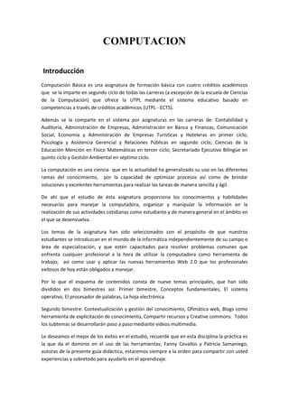 Este documento presenta una introducción al curso de Computación Básica impartido en la Universidad Técnica Particular de Loja. El curso tiene cuatro créditos académicos y se imparte en varios ciclos y carreras. La computación es una ciencia que optimiza procesos y brinda soluciones a través de herramientas. El curso proporciona conocimientos y habilidades para manejar la computadora y organizar información. Los temas incluyen conceptos básicos, sistemas operativos, procesadores de texto, hojas