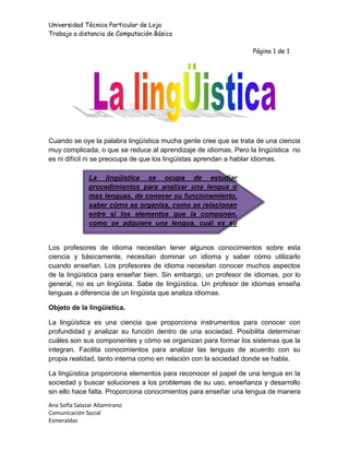 La lingüística estudia los procedimientos para analizar lenguas, cómo se organizan y adquieren, y su función en la sociedad. Aunque los profesores de idiomas necesitan conocimientos lingüísticos para enseñar bien, un lingüista se enfoca en analizar lenguas mientras que un profesor de idiomas enseña lenguas. La lingüística proporciona herramientas para analizar lenguas a profundidad, entender sus componentes y sistemas, y reconocer su papel en la sociedad.