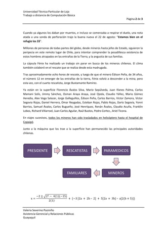 El resumen describe el rescate de los 33 mineros atrapados en Chile. 32 mineros ya han sido rescatados usando una cápsula llamada Fénix II que los sube uno a uno a la superficie. El rescate ha ocurrido en menos de 10 minutos para cada minero y ha progresado rápidamente. El mundo ha observado con interés la historia de los mineros atrapados por 69 días y ahora rescatados.