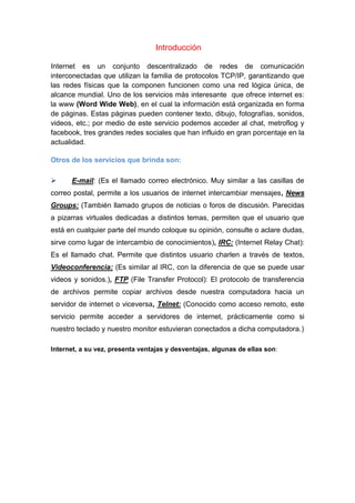 El documento resume los principales servicios que ofrece Internet como la World Wide Web, correo electrónico, grupos de noticias, chat e intercambio de archivos. También describe ventajas como acceso a información y comunicación global, pero también desventajas como contenidos inadecuados, virus, estafas y adicciones. Luego explica las redes sociales más populares como Facebook, Twitter y el chat, detallando sus características y usos positivos y negativos. Por último, presenta ejemplos del uso de Internet y redes sociales en la vida cotidiana