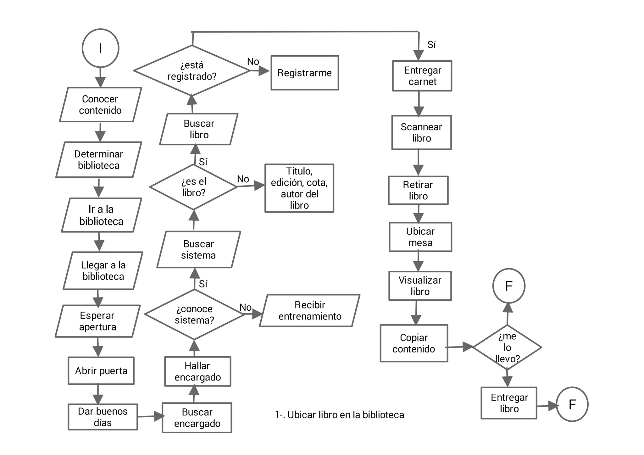 1. Ubicar un libro en la biblioteca encontrando primero el sistema para buscarlo, luego buscando el libro y verificando que esté disponible.