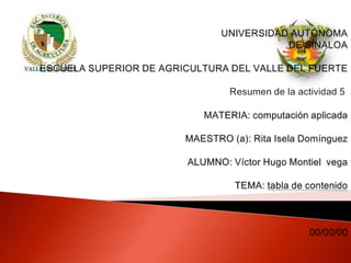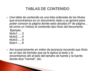 La tabla de contenido proporciona una lista ordenada de los títulos de un documento y la página en la que se encuentra cada uno. Un ejemplo muestra los tres primeros títulos y sus respectivas páginas. La tabla de contenido ayuda a los lectores a navegar rápidamente por el documento.