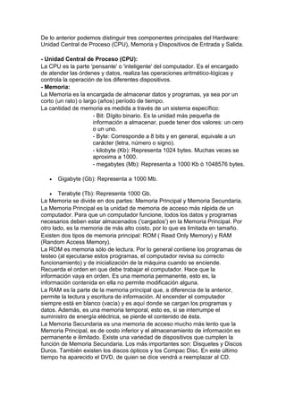 Un computador es una máquina capaz de recibir instrucciones a través de algún medio, entenderlas y ejecutarlas. Está compuesto de hardware, que son sus partes físicas como la CPU, memoria y dispositivos de entrada/salida, y software, que son programas e instrucciones. Un computador necesita tanto de hardware como software para funcionar y cumplir las tareas requeridas.