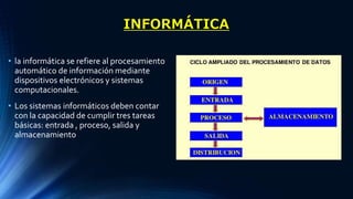 El documento habla sobre la informática y las computadoras. Explica que la informática se refiere al procesamiento automático de información mediante dispositivos electrónicos, y que los sistemas informáticos deben tener la capacidad de ingresar, procesar, almacenar y salir datos. Luego define una computadora como un dispositivo electrónico que acepta datos de entrada, los manipula, produce información de salida y almacena resultados, basándose en un programa. Finalmente, menciona brevemente la evolución de las computadoras y sus component