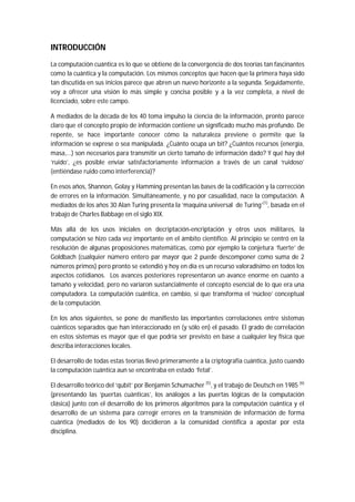 Este documento introduce los conceptos fundamentales de la computación cuántica. Explica que la computación cuántica surge de la convergencia entre la mecánica cuántica y la computación clásica. También resume las teorías clásicas de la información y la computación como base para la teoría cuántica de la información, la cual introduce el qubit como unidad básica de información cuántica.