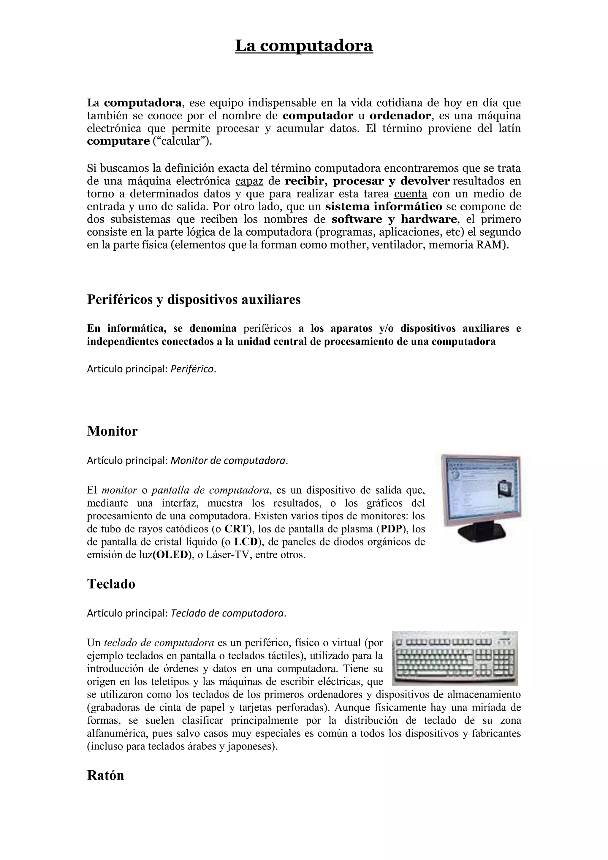 La computadora es una máquina electrónica que procesa y almacena datos. Se compone de hardware físico y software lógico. Los periféricos son dispositivos externos que se conectan a la computadora, como monitores, teclados, ratones, impresoras y altavoces. Los periféricos incluyen dispositivos de entrada, salida y almacenamiento. Los sistemas operativos gestionan los recursos de la computadora y permiten la interacción con el usuario.