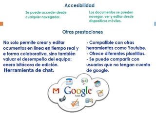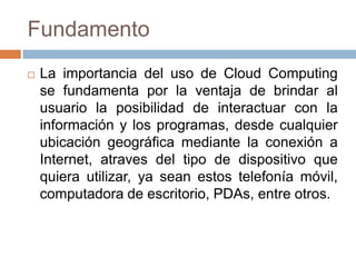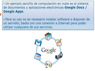 El documento habla sobre la computación en la nube y el almacenamiento en la nube. Explica que la computación en la nube permite a los usuarios acceder a sus aplicaciones y datos desde cualquier dispositivo con conexión a Internet. Luego discute ejemplos como Google Docs y Dropbox, servicios que permiten almacenar y compartir archivos en línea de manera gratuita o paga.