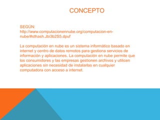 La computación en nube permite a consumidores y empresas acceder y gestionar archivos y aplicaciones a través de internet sin necesidad de instalar software, almacenando y procesando la información en centros de datos remotos.
