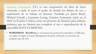 Los tags son etiquetas para clasificar contenido subido, como usar "Anime", "dibujo" y "manga" para un dibujo de anime. Las categorías clasifican entidades de forma jerárquica en grupos con características similares. Creative Commons otorga licencias para compartir trabajos artísticos sin restringir completamente su uso. WordPress es un sistema para crear sitios web y blogs son páginas personales actualizadas regularmente sobre un tema.