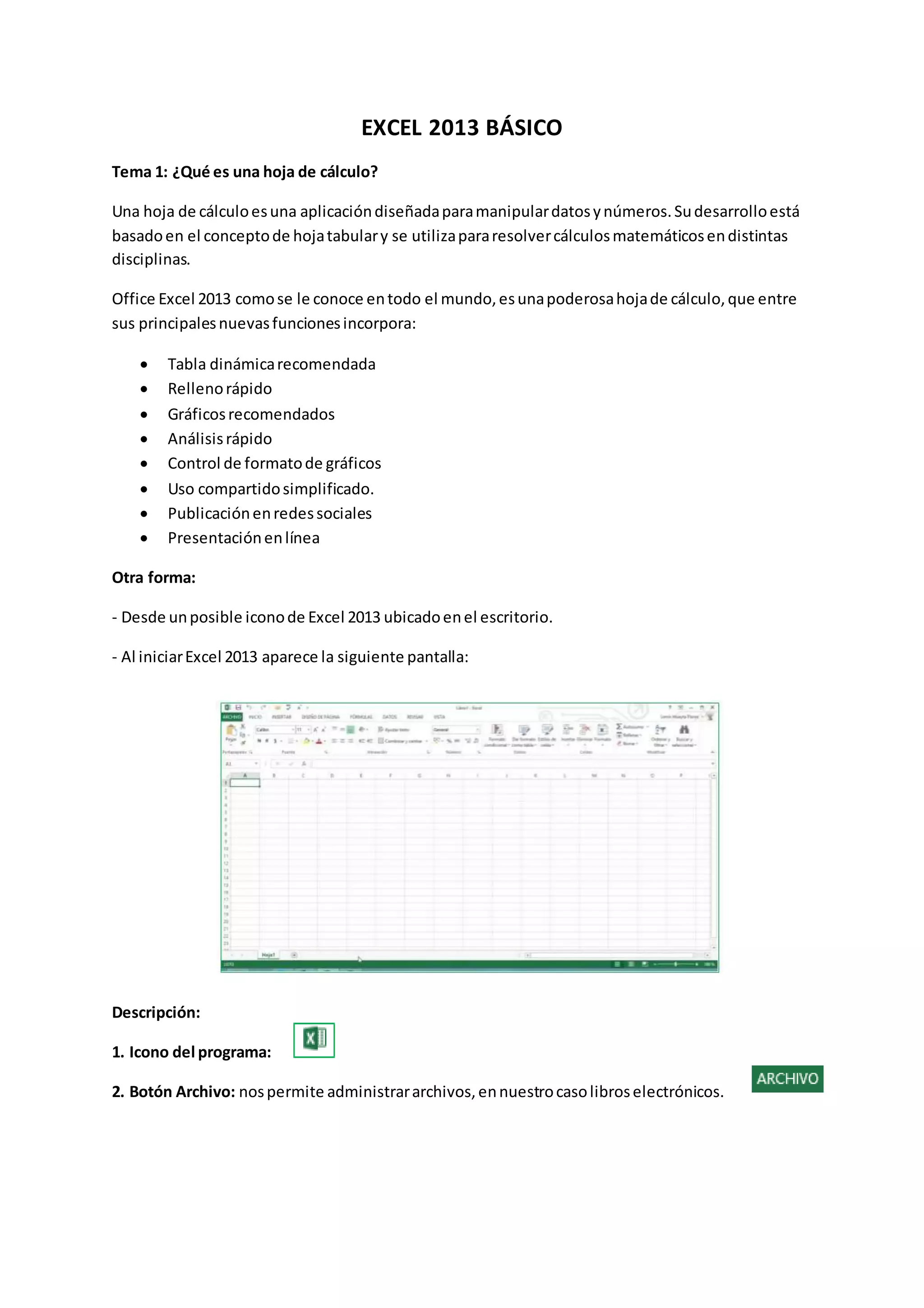 Este documento proporciona una introducción a Excel 2013, incluyendo una descripción de sus principales características y componentes. Explica que Excel es una hoja de cálculo que se utiliza para manipular datos y realizar cálculos matemáticos. Describe las pestañas y grupos que componen la cinta de opciones, y brevemente explica la función de cada pestaña principal como Inicio, Insertar, Diseño de página y Fórmulas.
