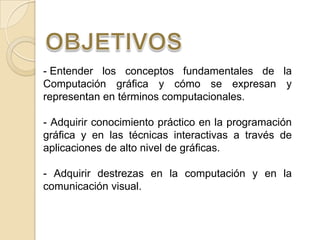 El documento presenta un proyecto de computación gráfica de la Universidad Nacional Mayor de San Marcos. El proyecto busca entender los conceptos básicos de la computación gráfica y adquirir habilidades prácticas en programación gráfica. El documento explica brevemente la definición de computación gráfica y los tipos de gráficos 2D y 3D.