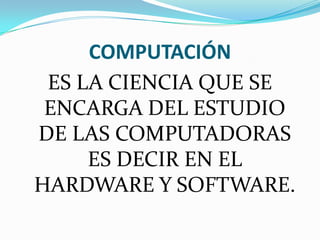 El documento define los conceptos de computación, informática, computadora, hardware y software. La computación se refiere al estudio de las computadoras y su hardware y software. La informática es el conjunto de técnicas necesarias para crear sistemas manuales o automáticos para procesar información. El hardware son las partes físicas de una computadora como las unidades de entrada, salida, procesamiento y almacenamiento. El software son los programas que permiten a las computadoras y personas observar resultados.