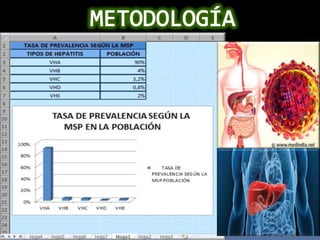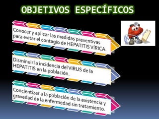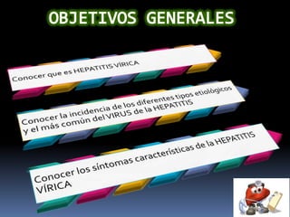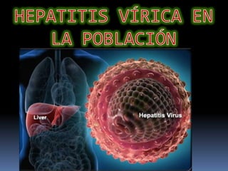 El documento proporciona información sobre los diferentes tipos de virus de la hepatitis, sus mecanismos de transmisión, síntomas y formas de prevención. Describe las características del VHA, VHB, VHC, VHD y VHE y cómo se transmiten. Explica que la gravedad de la hepatitis vírica depende de la respuesta inmune individual y que el tratamiento oportuno puede evitar la cronicidad o la muerte. También resalta que la vacunación, el control de donaciones de sangre y medidas de higiene son formas efectivas