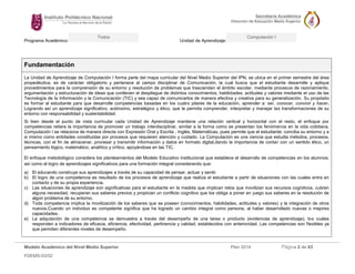 Este documento presenta la Unidad de Aprendizaje de Computación I para el Nivel Medio Superior del IPN. Describe la fundamentación, metodología, evaluación, competencias y perfil del docente de la unidad. La unidad se enfoca en desarrollar el pensamiento computacional mediante el uso de las TIC para buscar soluciones a problemas.
