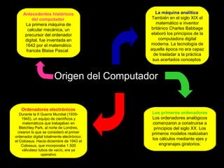 El documento resume la evolución histórica de los computadores, desde las primeras máquinas mecánicas de calcular en el siglo XVII hasta los circuitos integrados y ordenadores digitales del siglo XX. Se mencionan inventores clave como Blaise Pascal, Charles Babbage, y desarrollos importantes como el Colossus, ENIAC y los circuitos integrados que permitieron computadoras más pequeñas, rápidas y asequibles.