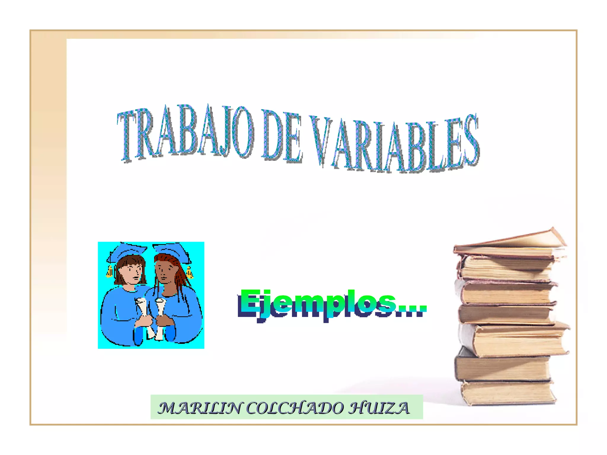 El documento presenta ejemplos de diferentes tipos de variables que pueden usarse en el trabajo de variables, incluyendo variables cuantitativas discretas y continuas, así como variables cualitativas nominales, ordinales y de escala. Se proporcionan cinco ejemplos para cada tipo de variable, como el número de visitas médicas, la estatura de los pacientes, los casos en el servicio de emergencia, el estado civil de los hospitalizados y los cambios físicos de un adulto mayor.