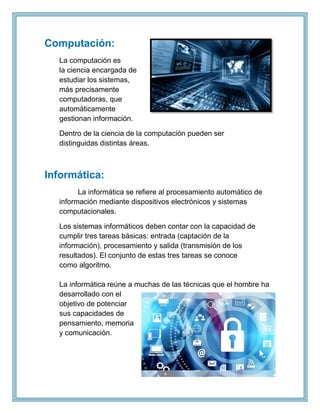 El documento habla sobre computación, informática, software y hardware. Define computación como la ciencia que estudia sistemas computacionales que procesan información de forma automática. Describe informática como el procesamiento de información mediante dispositivos electrónicos, requiriendo entrada, procesamiento y salida de datos. Explica que el software son las partes lógicas e intangibles de los sistemas, mientras que el hardware son las partes físicas como circuitos, cables y equipos periféricos.