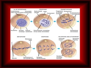 La mitosis es el proceso de división celular donde una célula madre se divide en dos células hijas idénticas. Consta de varias fases: en la profase los cromosomas se condensan y forman estructuras visibles; en la metafase los cromosomas se alinean en el ecuador de la célula; en la anafase los cromosomas son separados hacia los polos opuestos de la célula; y en la telofase y citocinesis se completan las divisiones dando lugar a dos células hijas idénticas.