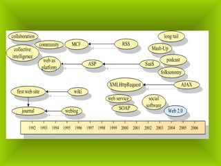 La Web 2.0 se refiere a una segunda generación de la Web basada en comunidades de usuarios y servicios como redes sociales y wikis que fomentan la colaboración e intercambio de información. Surge de páginas estáticas a páginas dinámicas actualizadas por usuarios. Incluye características como blogs, APIs, sindicación de contenidos y que los usuarios controlen su propia información.