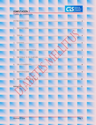 Este documento presenta una monografía sobre la diabetes. Define la diabetes como una enfermedad crónica causada por la falta de insulina o resistencia a la insulina, lo que provoca niveles altos de azúcar en la sangre. Describe los tres principales tipos de diabetes y sus síntomas. Explica que la diabetes se diagnostica mediante exámenes de sangre y orina y que su tratamiento implica medicamentos, dieta y ejercicio para controlar los niveles de azúcar en la sangre y prevenir complicaciones.