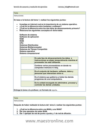 Este documento ofrece servicios de asesoría y resolución de ejercicios para asignaturas de computación y ciencias a través del correo electrónico ciencias_help@hotmail.com o en la página web www.maestronline.com. Incluye instrucciones para varias tareas relacionadas con conceptos de sistemas operativos, redes, programación y estadística que deben ser resueltas y enviadas al profesor.